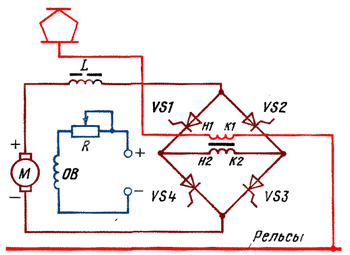Для работы рекуперации тяговые двигатели переводят в генераторный режим, обеспечивая их независимое возбуждение. Одновременно изменяют полярность обмоток якорей для того, чтобы направление генерируемого тока соответствовало прямой проводимости тиристоров. Для этого необходимо установить соответствующее направление тока в обмотках возбуждения ОВ. Напряжение от тяговых двигателей, работающих в генераторном режиме, подводится к инвертору, плечи которого соединены по схеме моста. В диагональ моста включена вторичная обмотка тягового трансформатора Т [1].
