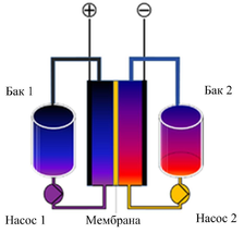 Потоковая батарея состоит из двух баков: в одном хранится жидкость для окислительной реакции, а в другом для восстановительной. Потоковая батарея представлена на рисунке 3.1.