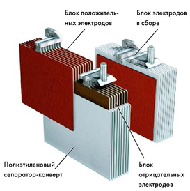 Рисунок 3.2 – Ячейка свинцово – кислотного аккумулятора с положительными и отрицательными электродами, разделёнными сепараторами [8]