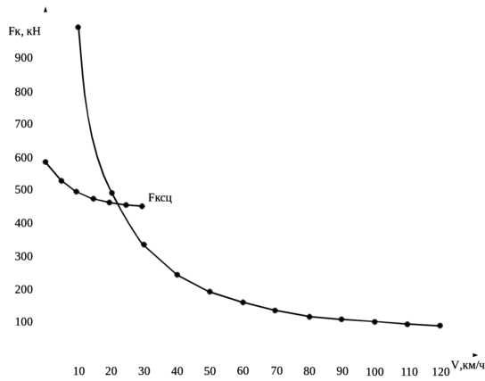 Для определения силы тяги Fкср следует воспользоваться тяговой характеристикой гибридной установки.