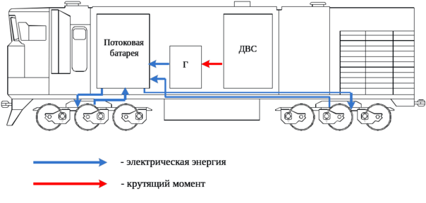Рисунок 4.2 – Схема работы гибридной установки на локомотиве (Г - генератор, ДВС – двигатель внутреннего сгорания)