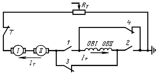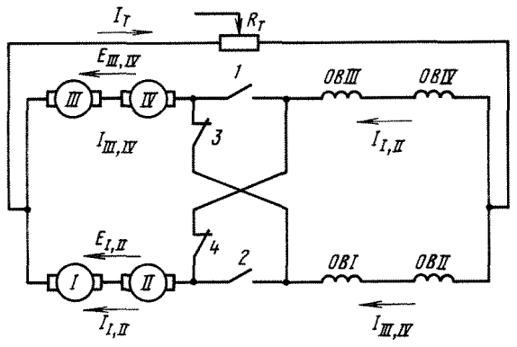 Наилучшее распределение нагрузок между тяговыми машинами и их устойчивую работу обеспечивает так называемая перекрестная схема (на рисунке 2 контакты 1, 2 разомкнуты, а контакты 3, 4 замкнуты).