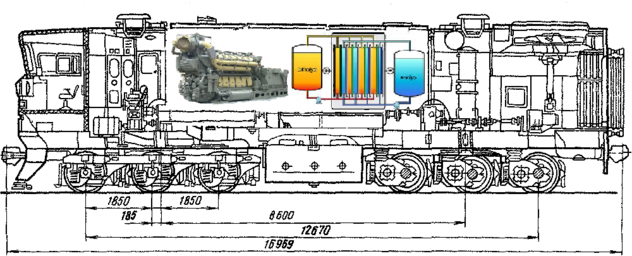 Для создания гибрида на тепловоз будут установлены электромотор nanoFlowcell и ДВС типа 8чн26/26, которые будут работать по принципу параллельного гибрида. В этом случаи два источника мощности работают по отдельности или параллельно. По отдельности, например: электромотор работает для экономичности, дизель для увеличения мощности. Так же они могут работать параллельно, например ДВС может работать в режиме генератора, заряжая ионную жидкость в аккумуляторах электромотора.