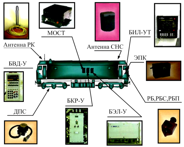 Составные части КЛУБ-У. Комплектующие аппаратуры (рисунок 1.5): блоки электроники БЭЛ-У, индикации БИЛ-УТ, а также индикации помощника машиниста БИЛ-Пом, коммутации и регистрации БКР-У-Ш (БКР-У-2М), антенна спутниковой навигации АУУ-1Н, приемопередающее устройство цифровой радиосвязи, блоки питания ИП-ЛЭ, ввода и диагностики БВД-У, датчики пути и скорости ДПС-У.