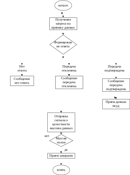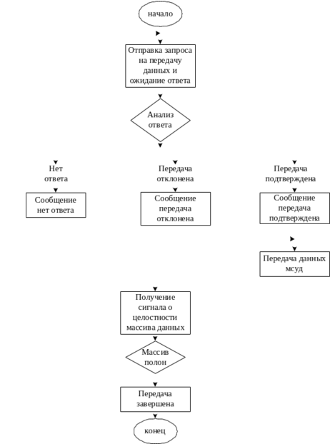 Аппаратура локомотива, войдя в зону покрытия, которую обеспечивает станционная аппаратура начинает отправлять запрос на передачу данных, после чего получает ответ и в случае подтверждения передачи происходит отправка данных мсуд на рабочее место станции. После чего происходит проверка переданного объема данных на целостность и получение ответа с рабочего места о том, что информация успешно передана. На рисунке 3.3 представлен алгоритм передачи данных МСУД.