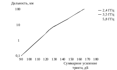 | Мощность передатчика/ Чувствительность приемника | FSL, дБ | D, км |