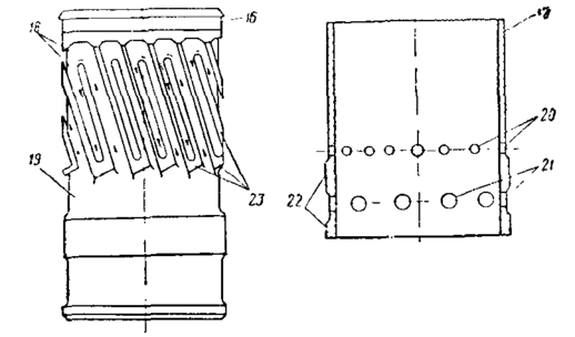 Кольцевая проточка соединена с 15 канавками (через одну). Все канавки выходят в проточку, расположенную в верхней части гильзы [13].