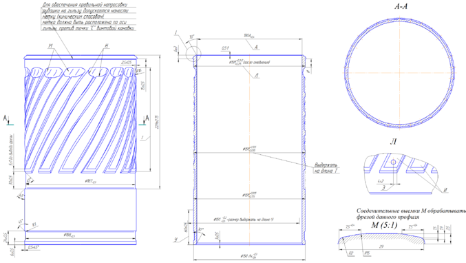 На наружной поверхности гильзы профрезеровано 30 винтовых канавок под углом 30° к оси гильзы.