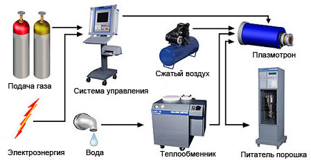 Установка для плазменного напыления включает: распылитель (плазмотрон), источник питания, газораспределительную систему, механизм подачи материала, система охлаждения, пульт управления и различные элементы оснастки.