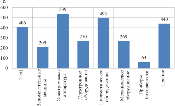 Из гистограммы, представленной на рисунке 1.4, можно сделать вывод, что больше всего электровозы становились на неплановый ремонт из-за неисправной электрической аппаратуры, а меньше всего – из-за неисправных приборов безопасности.