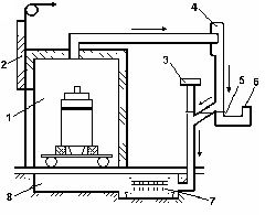 Рисунок 2.1 – Электрическая печь с регулируемой пропиточно-вытяжной вентиляцией: 1 – сушильная камера; 2 – плита; 3 – фильтр; 4 – насос-вентилятор; 5 – заслонка; 6 – выхлопная труба; 7 – электронагревательные элементы; 8 – теплообменник