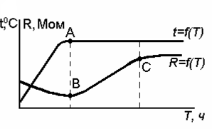 собственно сушки, при которой сопротивление изоляции постепенно растет, пока не достигнет установившейся величины в точке С. Эта точка определяет момент окончания процесса сушки.