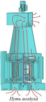 Далее, платформа, через ведущий ролик и редуктор, приводится во вращение двигателем (приводом основания) мощностью 1 кВт. Подается питание на излучатели, впоследствии нагревающие обмотку остова тягового двигателя. Двигатель (привод вентилятора), также мощностью 1 кВт, и вентилятор производят отсос воздуха из остова, тем самым осуществляя конвекцию, а создаваемое вентилятором разряжение воздуха в верхней части остова, обеспечивает ещё более эффективную сушку. Схема движения воздуха при осуществлении конвекции в установке представлена на рисунке 3.5.