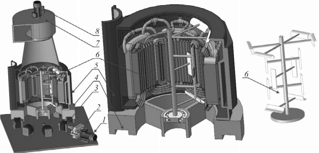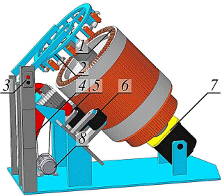 Рисунок 3.4 – Установка сушки остовов ТЭД комбинированным способом: 1 – привод основания; 2 – редуктор; 3 – резиновые ролики; 4 – платформа; 5 – остов; 6 – стойка; 7 – вентилятор; 8 – привод вентилятора