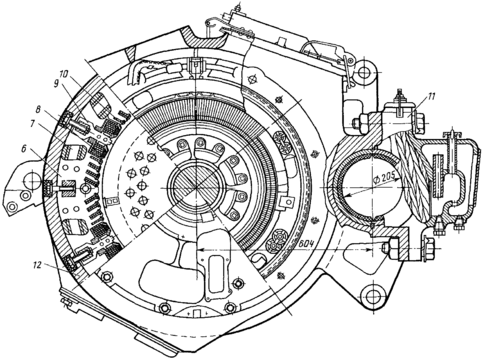Рисунок 4.1 – Тяговый двигатель НБ-514: 1,4 – подшипниковые щиты; 2 – траверса; 3 – якорь; 5 – подшипник; 6 – сердечник главного полюса; 7 – катушка главного полюса; 8 – катушка добавочного полюса; 9 – сердечник добавочного полюса; 10 – катушка компенсационной обмотки; 11 – моторно-осевой подшипник; 12 – остов