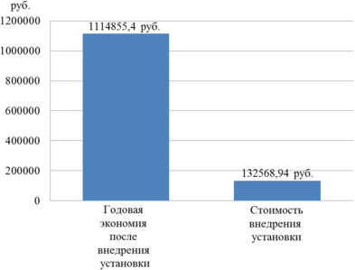 Годовая экономия денежных средств после внедрения установки для восстановления изоляции лобовой части обмотки якоря составила 1114855,4 рублей, а стоимость на внедрение установки 132568,94 рублей. Так же, изоляция, восстановленная с помощью ИК-излучения, надежнее и долговечнее. На рисунке 6.1. наглядно представлены затраты на внедрение установки и экономия средств после внедрения.