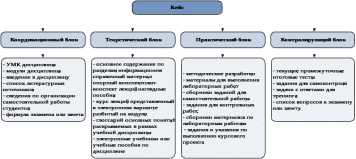 Содержание кейса инвариантно. В общем виде может быть представлен как четырехкомпонентный учебного кейса, имеющий блочную структуру (рисунок 4.5): координирующий блок, информационный блок, практический блок и контролирующий блок.