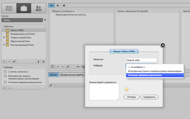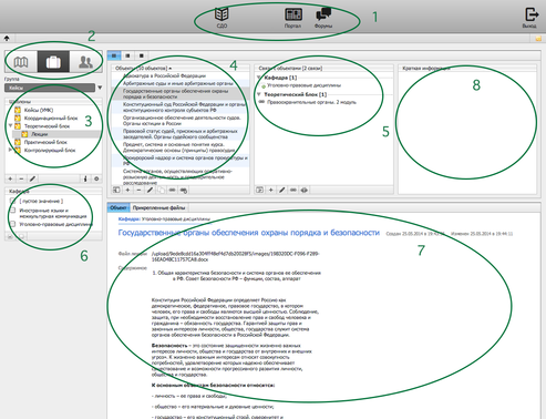 5 – Область, связанная с объектом других объектов (сгруппированные по названиям шаблонов); 6 – Дополнительный рубрикатор; 7 – Область просмотра содержимого объекта;