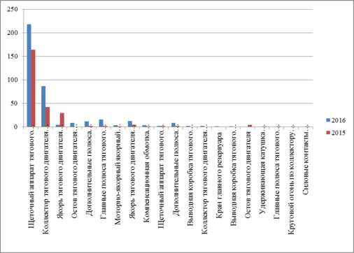 Рисунок 1.1 – Распределение неисправностей ТЭД по узлам за 1 квартал 2015 и 2016 года