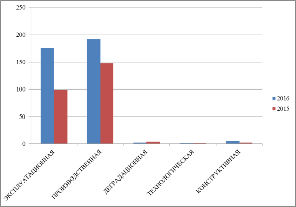 При разложении неисправностей по видам получилось, что наибольшее количество неисправностей допущено по эксплуатационной и производственной причине, что отражено в таблице 1.2 и показано на рисунке 1.2.
