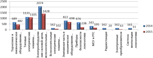 Наибольшее количество неплановых ремонтов по электровозам за 12 месяцев 2014 года допущено по причине выхода из строя следующего оборудования: