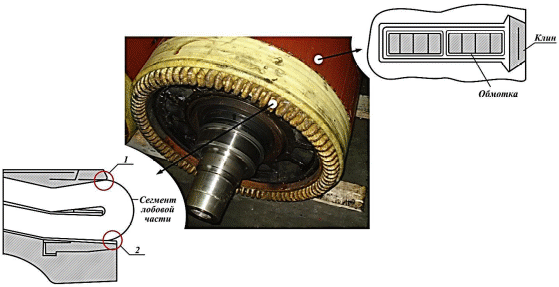 Рисунок 1.7 – Участки проникновения влаги в паз из-за несовершенства конструкции обмоток якоря электродвигателя НБ-514: 1, 2 – зоны возможного проникновения влаги