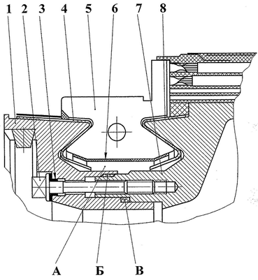 Медные пластины изолированы друг от друга изоляционными прокладками, а от втулки и нажимного конуса – изоляционными манжетами и цилиндром. Герметичность коллекторной камеры А обеспечивается за счет двух уплотнительных замков Б и В, которые наполнены уплотнительной замазкой. Для надежной фиксации коллектора его насаживают на втулку якоря с натягом, а также дополнительно фиксируют гайкой [3].