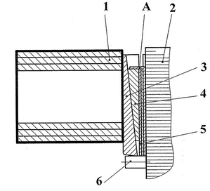Катушка 1 крепится в соответствии с рисунком 2.4 на сердечнике полюса 2 при помощи алюминиевых планок 3, клиньев 4 и регулировочных прокладок 5. Стопорение планки 3 и клина 4 обеспечено упорами 6 и отогнутым усом А. Поверхность катушки, приложенная к остову, имеет приклеенные прокладки изготовленные из электронита. Это гарантирует защиту изоляции катушки от повреждений и плотного зажатия катушки между наконечником полюса и остовом. Полюс с закрепленной на нем катушкой обработан в эпоксидном компаунде, и представляет собой единый монолитный блок после выпечки.