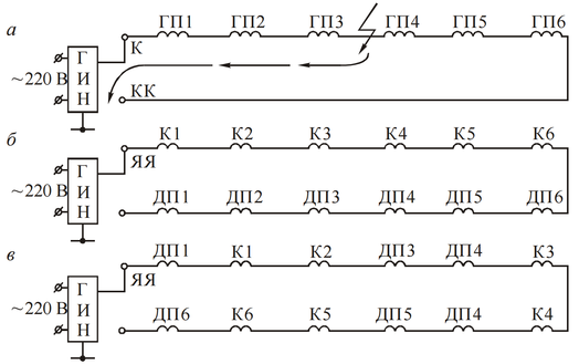 Чтобы избежать ошибок в измерении, следует начинать с полюсной ка- тушки ГП1 или ГП6. Если пробой изоляции произошел в месте, показанном на рисунке 3.2, а, то цепь тока замкнется по пути, указанному стрелками. В этом случае индикатор отметит показания на катушках ГП1, ГП2 и ГП3, а на катушках ГП4, ГП5 и ГП6 показаний не будет.