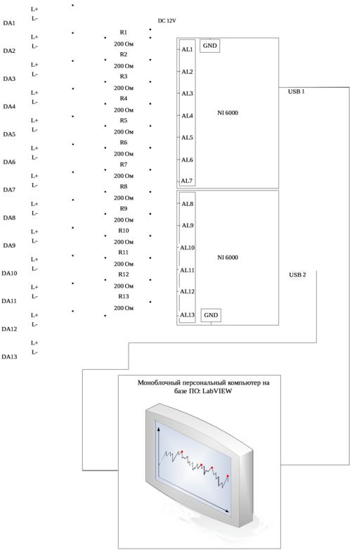 В простейшем случае датчик может быть подключен с помощью одного резистора и блока питания 9 .. 12 В к АЦП. В роли АЦП у нас выступает преобразовательный прибор NI 6000, который в свою очередь присоединяется к компьютеру посредством интерфейса full-speed USB и содержит семь каналов ввода аналоговых сигналов (AI). Каналы ввода аналоговых сигналов 0–7 служат для измерений напряжения в схеме с общим проводом; каждая линия предназначена для ввода одного сигнала.