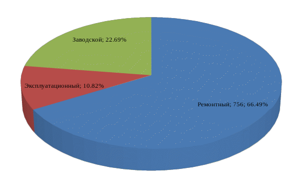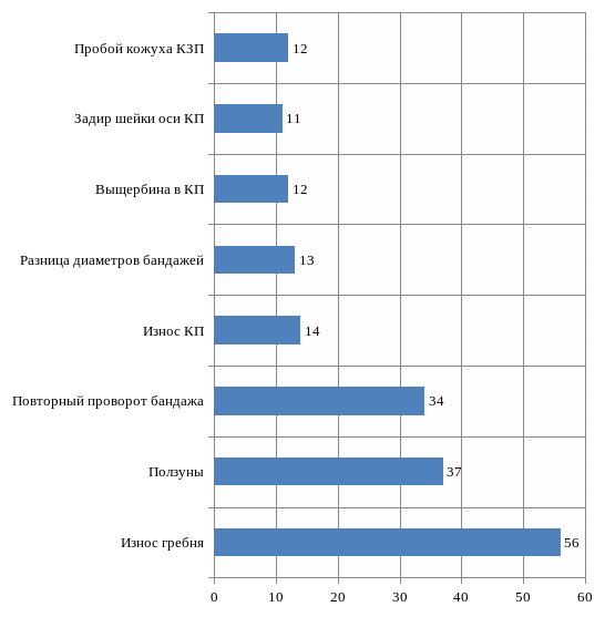 Из таблицы 2.1 видно, что основными неисправностями являются износ гребня (56 случаев; 27 процентов), ползуны (37 случаев; 18 процентов), повторный проворот бандажа (34 случая; 16 процентов).