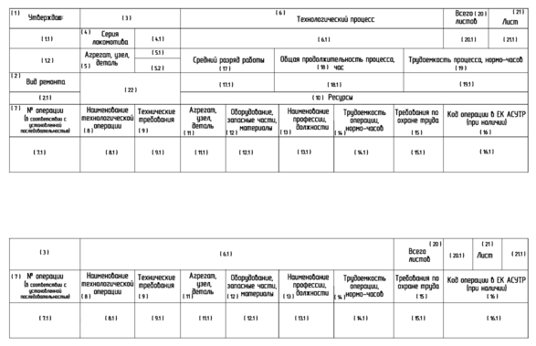 Форма карты технологического процесса обслуживания и ремонта локомотивов согласно «Технических требований на разработку технологических процессов для технического обслуживания и текущего ремонта локомотивов, их агрегатов, узлов или деталей ПКБ.ЦТ.06.0090» ( далее ТТ) представляет собой таблицу. В верхней части формы находиться штамп. На первом листе он расширенный, на последующих листах сокращенный.
