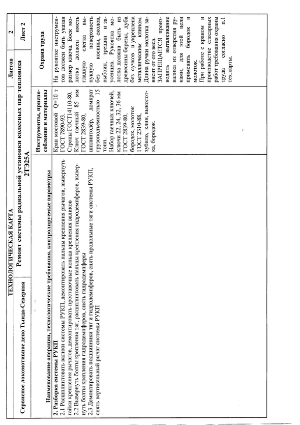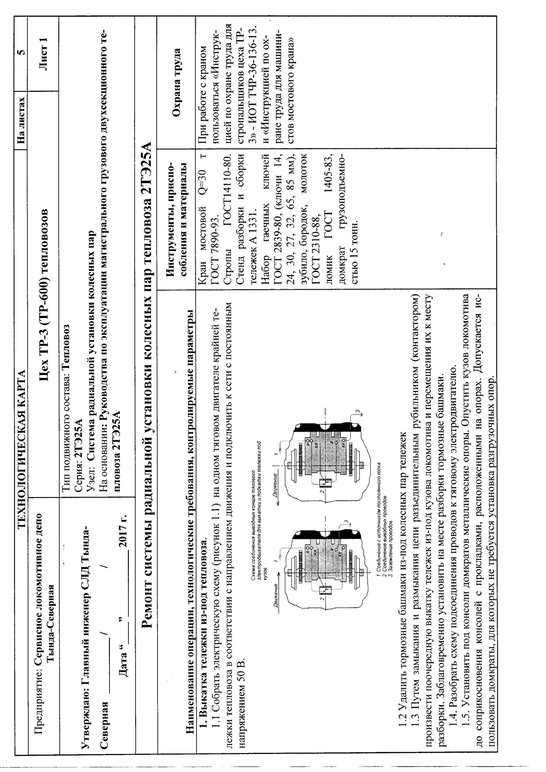 Разрабатывается технологическая карта на основании «Руководстава по эксплуатации магистрального грузового двухсекционного тепловоза 2ТЭ25А», утвержденного техническим директором ЗАО «УК «Брянский машиностроительный завод» от 29.12.2009 г. Все эти данные вносятся в технологическую карту.