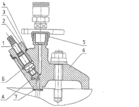 1 – шпиндель; 2 – штуцер; 3,7 – прокладки; 4 – пластина замочная; 5 – колпачок; 6 – корпус крана; А, Б – конусы уплотняющие.