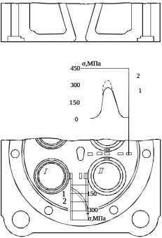Рисунок 1.4 – Распределение остаточных напряжений по длине перемычки между клапанами крышки цилиндра