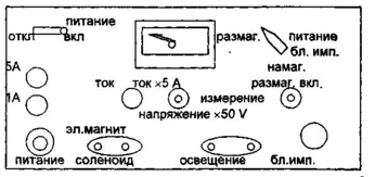 - при работе с блоком управления шарнирный электромагнит постоянного тока, снабженный универсальными полюсными наконечниками игольчатой конструкции, обеспечивающий удовлетворительный контакт с деталями произвольной геометрической формы; соленоид с диаметром отверстии 90 мм и длиной 160 мм, рассчитанный для работы с блоком управления и для непосредственного включения в сеть. На щитке соленоида установлен выключатель «Постоянный ток» — «Переменный ток». Эти надписи носят условный характер: в первом случае параллельное соединение секции обмотки, во втором – последовательное. При работе от сети 50 Гц 220 В работа в положении «Постоянный ток» допускается кратковременно;
