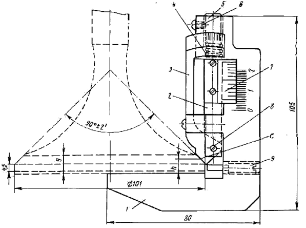 1 — корпус; 2 — стержень; 3 — фиксатор; 4 — пружина; 5 — заглушка; 6 — стопорный винт; 7 — нониус; 8 — ось; 9 — ограничитель