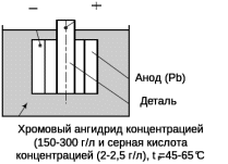 В качестве анода применяются не хром, а свинец; причиной этого являются легкость анодного растворения хрома; хрупкость металлического хрома; высокая стоимость изготовления массивных электродов. Отношение площади анода к площади катода: 1/1 или 2/1. В качестве электролита используется раствор хромового ангидрида и для улучшения протекания процесса добавляют до 4% Н2SO4 . Во время электролиза содержание хрома в электролите постоянно уменьшается, что требует постоянного добавления GrO3. Источником питания могут служить низковольтные генераторы постоянного тока или селеновые выпрямители (рисунок 2.7) [6].