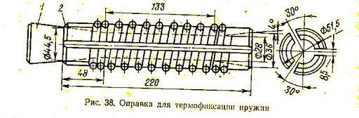 Пружины с недопустимой силой, высотой и отклонением оси от перпендикуляра к торцовой плоскости в отдельных случаях восстанавливают по следующей технологической схеме: нагрев, разводка, закалка, отпуск и механическая обработка торцов. Нагревают пружины перед разводкой в электрической или газовой печи. Разводку ведут так, чтобы шаг витков был равномерным, высота пружины была несколько больше номинальной, а крайние витки оставались прижатыми. После разводки пружину фиксируют на оправке и подвергают термообработке.