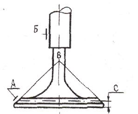 После механической обработки клапана необходимо, чтобы радиальное биение рабочей поверхности ллапана “А” относительно направляющей “Б” клапана было не более 0,05 мм, вершина конуса детали совпадала с осью клапана или отверстия охватывающей детали (точка “В” на рисунке 2.5).