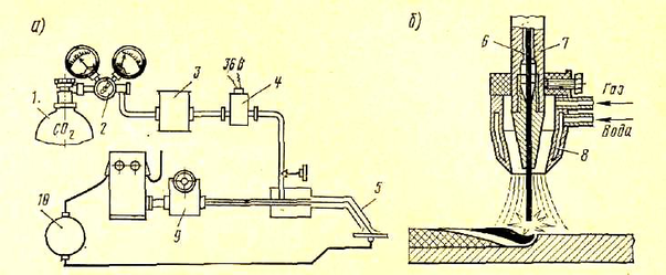 1 — баллон с газом; 2 —редуктор; 3 – влагоотделитель; 4 — электрический подогреватель; 5 — газовая горелка; 6 — электродная проволока; 7 — мундштук с наконечником; 8 — охлаждаемая полость горелки; 9—подающий механизм; 10 — сварочный генератор