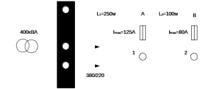 Задача. Проверить, удовлетворяет ли отключающей способности по схеме выбранное сечение нулевого провода линии, показанной на рисунке 6.1. Линия 380/220 В с медными проводами 3×25+1×16 мм² питается от трансформатора 400 кВА (рисунок 6.2).