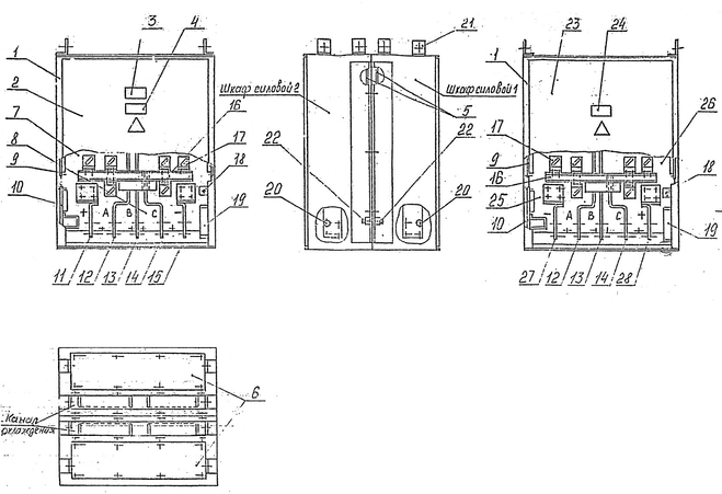 1-каркас; 2-щит; 3-щиток заводской; 4-табличка; 5-панель; 6-съемная панель; 7-блок диодов; 8-блок диодов; 9-плата сигнализации; 10-блое реле; 11-шина “+”; 12-шина “А”; 13-шина “В”; 14-шина “С”; 15-шина “-”; 16-шина; 17-предохранитель; 18-конечный выключатель; 19-клеммный блок; 20-болт М12х55; 21-грузовой уголок; 22-болт заземления; 23-щит; 24-табличка; 25-блок диодов; 26-блок диодов; 27-шина “+”; 28-“-”