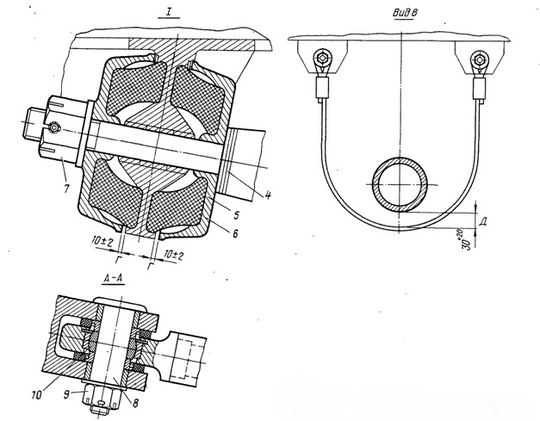 Наклонная тяга крайней и средней тележек (рис. 3.1) предназначена для передачи сил тяги и торможения от тележки к кузову., Тяга 3 представляет толстостенную трубу с приваренными по концам литыми головками.Одной головкой тягу 3 крепят к вилке 1 буферного устройства кузова, другой— к тяговому устройству тележки. Крепление тяги осуществляют валиками с гайками 9. Тросик 2 страхует тягу от возможного падения на путь при поломках. Подвижность тяги в. горизонтальной плоскости при относе кузова в разворотах тележки обеспечивают шарнирные подшипники 10,прессованные в головки тяги.