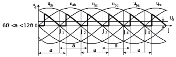 . Поскольку интервал проводимости вентилей смещен по времени на угол , пределы интегрирования кривой напряжения ud также увеличены на угол по сравнению с формулой (1.11) для схемы мостового неуправляемого выпрямителя. Формула для расчета Ud принимает вид: