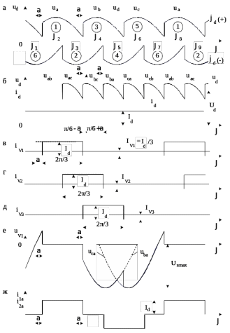 Рисунок 1.10 – Диаграммы работы мостового трёхфазного управляемого выпрямителя