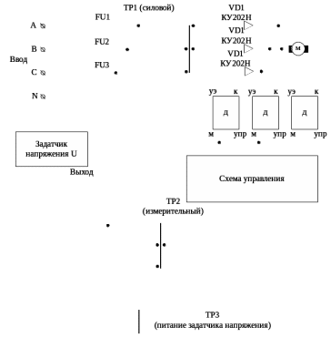 Схема управления снимает параметры питающей сети (напряжение) со вторичных обмоток измерительного трансформатора ТР2. Управляющие сигналы со схемы управления подаются на схему формирования управляющих импульсов тиристоров (драйверы), одновременно на драйверы подается напряжение от задатчика напряжения.