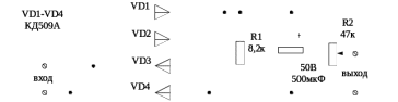 Задатчик напряжения представляет собой однофазный мостовой выпрямитель, нагруженный сопротивлением R1 номиналом 8,2 кОм, а так же переменным резистором R2 номиналом 47 кОм, с подвижного движка которого снимается напряжение задатчика, подаваемое в схему управления выпрямителя. Конденсатор С1, емкостью 500 мкФ служит для сглаживания пульсаций питающего напряжения.