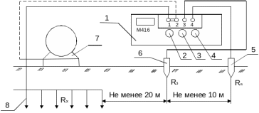 Контроль сопротивления заземления электроустановок производится прибором М416 (измеритель сопротивления заземления). При измерении прибор следует располагать в непосредственной близости от измеряемого заземлителя Rx, так как при этом на результате измерения сказывается сопротивление проводов, соединяющих прибор с заземлением.