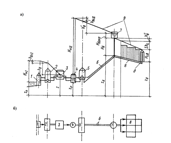 Рисунок 1.1 – Схема водоснабжения города а) продольный профиль; б) план; 1-водоприемное сооружение; 2-насосная станция 1 подъема; 3-очистные сооружения; 4-резервуары чистой воды; 5-насосная станция 2 подъема; 6-водоводы; 7-водонапорная башня; 8-магистральная водопроводная сеть; 9-пьезометрические линии в период максимального водопотребления.